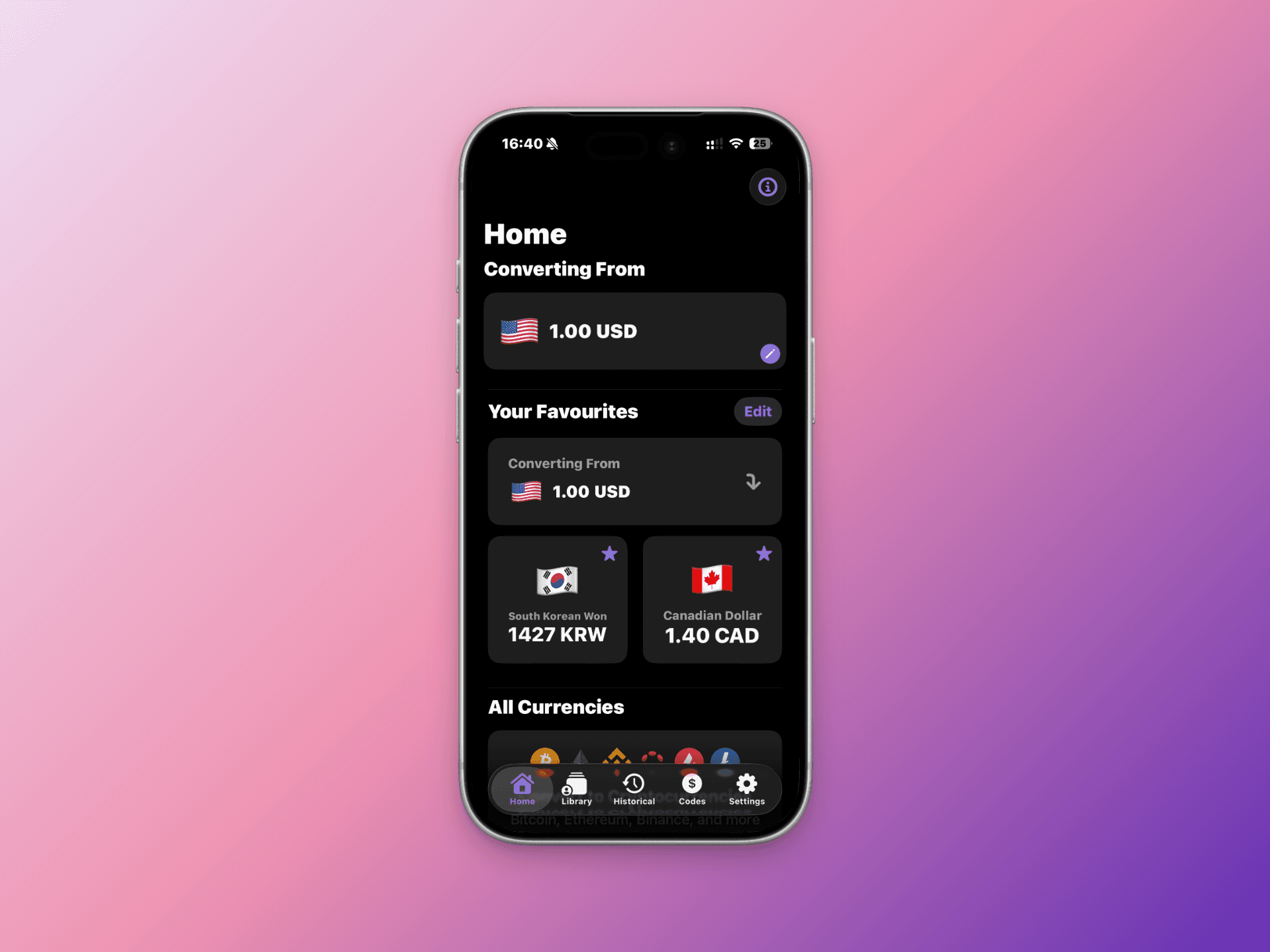 Converta is a currency converter app whose users can convert to 159 currencies easily. You can save frequently used conversions to your Library, convert to crypto currencies, and access historical data.